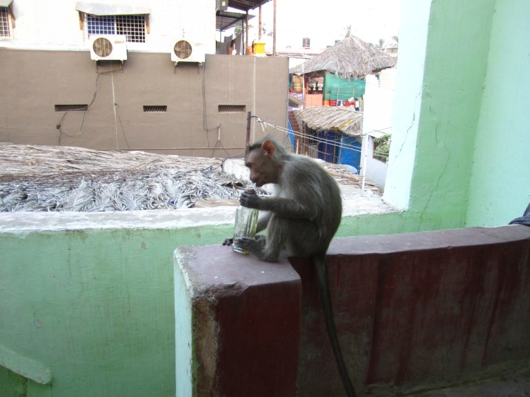 Having lingered further north at the beginning of our trip we had decided to try and see the delights of Hampi’s historic ruins in a single day, using the night bus to get in and out. Standing on the rooftop of the Vicky’s Guesthouse, who had kindly agreed to look after our bags for the day, this didn’t feel like such a smart idea. After breakfasting at the same guesthouse, where Aleks inadvertently shared her banana pancake with one of the local monkeys, we headed in to the streets. As the ruins of Hampi are spread over a vast area we would need transport. So to work off some of those delicious curries of the last couple of weeks we rented two bikes.