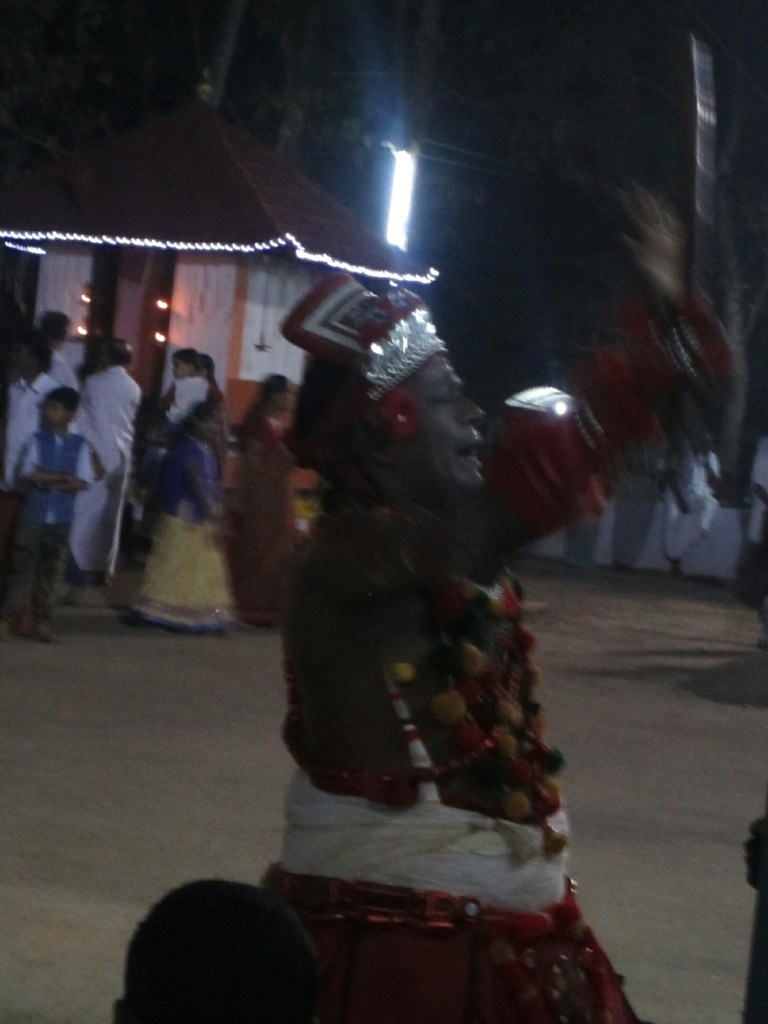 The festival was due to start with some night Theyyams in the evening, so we took a tuk-tuk around 7pm out to Chala. We knew we had found the right place by the crowds, far larger than you might expect from a village that size, which only got bigger as the night went on. After around 10 minutes of waiting, a line of men struck up a constantly altering my rhythm on different drums. Shortly after, the first Theyyam actor, led by a man with burning brazier, began to perform. Dressed in a large hooped skirt-like garment, and naked from the waist up apart from a simple red headdress he span around, and performed a strange dance involving thrusting movements of a short wooden stick as he moved. He was then led round the gathering crowd, this time by an oil lamp, where he gestured at sections the assembling crowd to stand (including us; there was definitely no question of not obeying the mildly terrifying glance emanating from his painted face). To each section he shouted a loud call I can only describe as close to the sound men in a rugby scrum make upon engagement.
