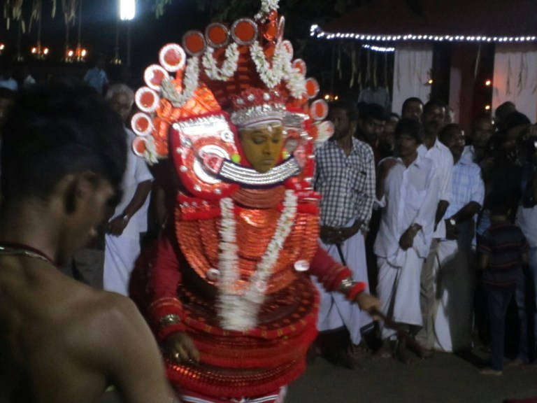 A Theyyam is an event which happens only in the winter months in the small village temples of North Kerala, but within this small time and space, thousands of Theyyams take place. They are best described as a ritualistic dance ceremony featuring elaborate headdresses and makeup. During the dance, people believe the Theyyam actors actually become the gods themselves. A great source on Theyyam worship is the source where I first read of them, William Dalrymple’s book “Nine Lives” – a Christmas present to Aleks which I stole.